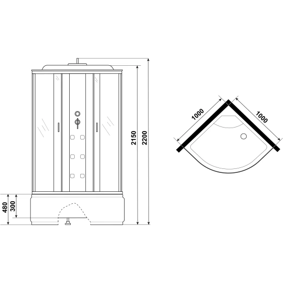 Душевой шланг, Душевая лейка, Держатель для душевой лейки, Подключение для душевого шланга, Полочка, Верхний душ, Динамик, Поддон, Сиденье, Радио, Смеситель, Сифон, Мыльница, Штанга душевая, Ножки, Зеркало