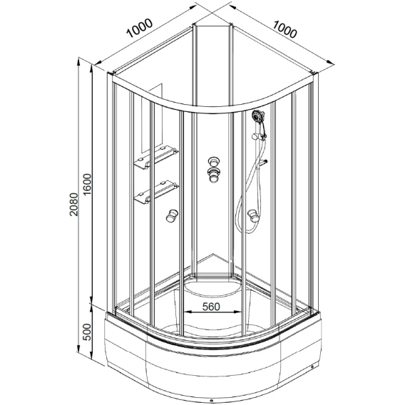 Душевой шланг, Душевая лейка, Держатель для душевой лейки, Полочка, Ручки, Металлический каркас, Поддон, Сиденье, Смеситель, Сифон, Штанга душевая, Ножки, Зеркало