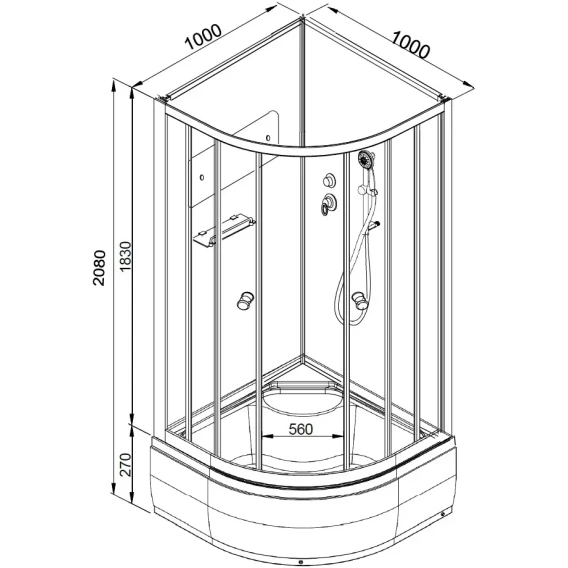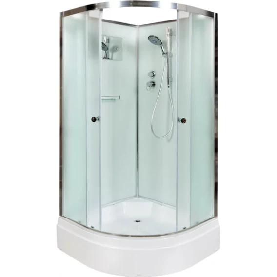 Душевой шланг, Душевая лейка, Держатель для душевой лейки, Полочка, Ручки, Крючок, Металлический каркас, Поддон, Смеситель, Сифон, Штанга душевая, Ножки, Зеркало