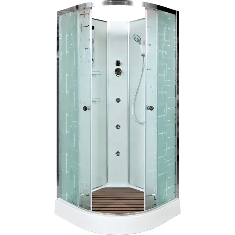 Душевой шланг, Душевая лейка, Держатель для душевой лейки, Полочка, Ручки, Металлический каркас, Поддон, Смеситель, Сифон, Штанга душевая, Ножки, Зеркало, Настил
