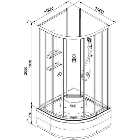 Душевой шланг, Душевая лейка, Держатель для душевой лейки, Полочка, Ручки, LED подсветка, Металлический каркас, Поддон, Смеситель, Сифон, Штанга душевая, Ножки, Зеркало