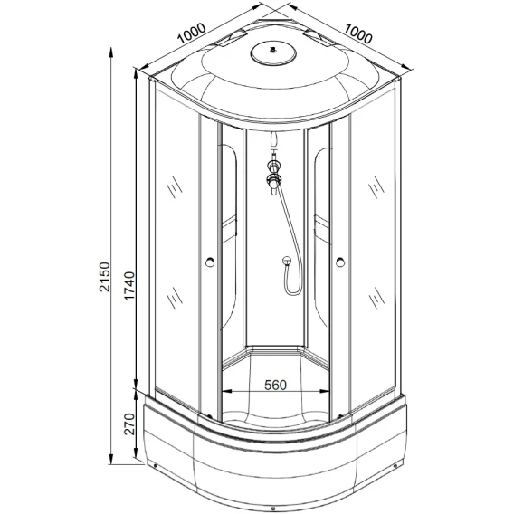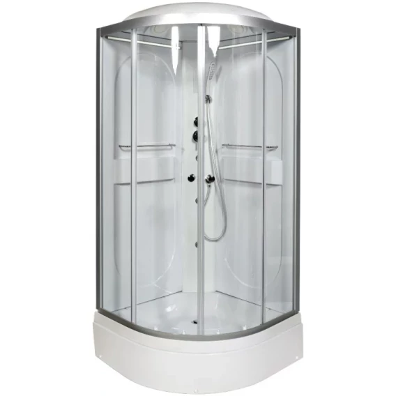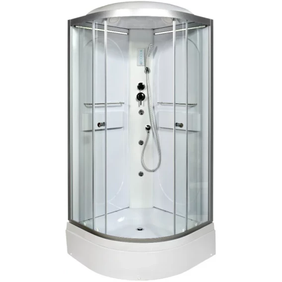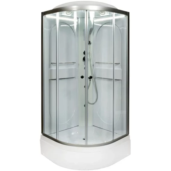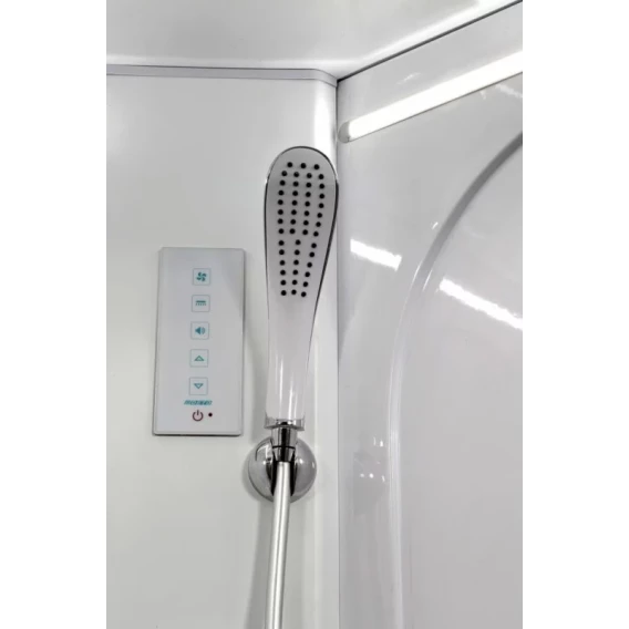 Душевой шланг, Душевая лейка, Держатель для душевой лейки, Подключение для душевого шланга, Ручки, LED подсветка, Верхний душ, Динамик, Металлический каркас, Поддон, Радио, Смеситель, Сифон, Ножки