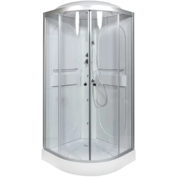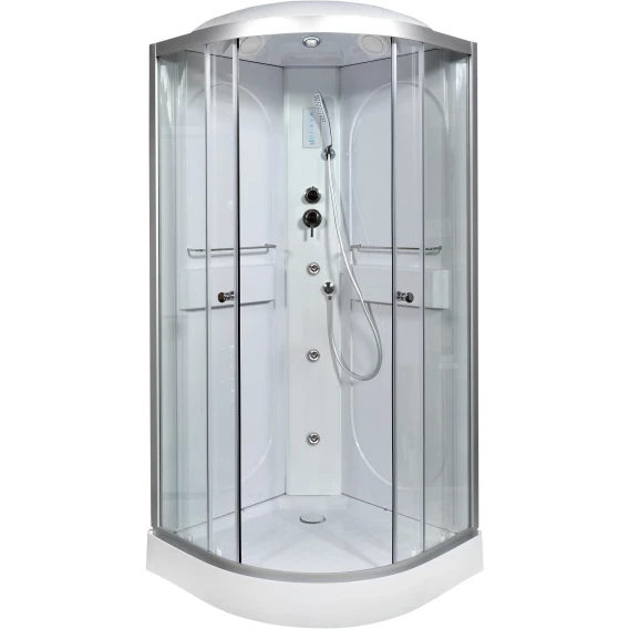 Душевой шланг, Душевая лейка, Держатель для душевой лейки, Подключение для душевого шланга, Ручки, Подсветка, Верхний душ, Динамик, Металлический каркас, Поддон, Радио, Смеситель, Сифон, Ножки