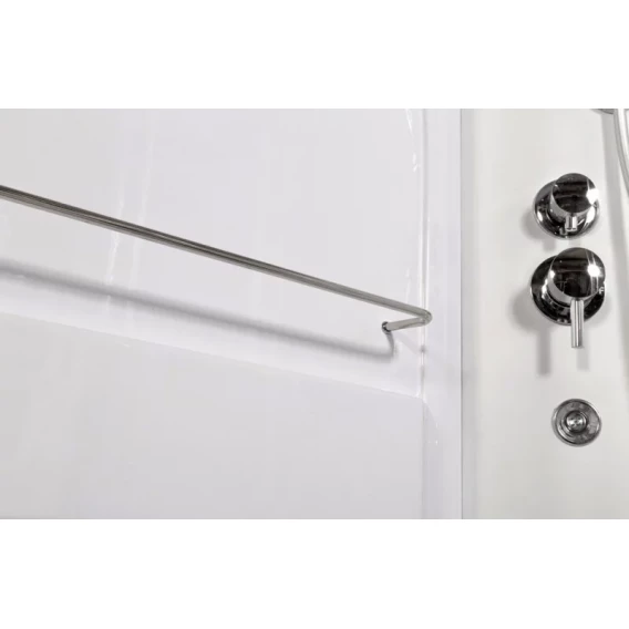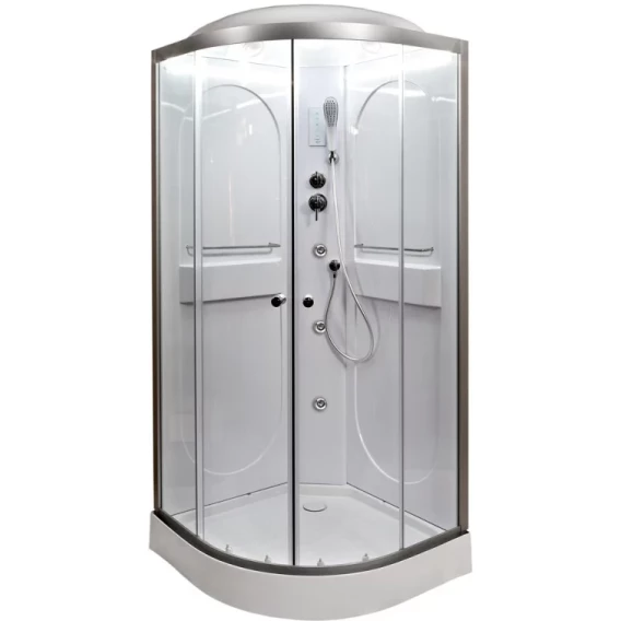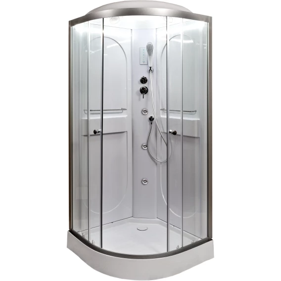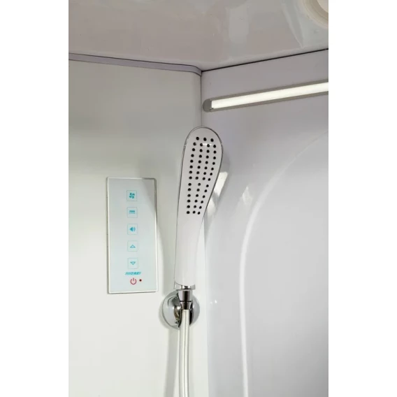 Душевой шланг, Душевая лейка, Держатель для душевой лейки, Подключение для душевого шланга, Ручки, LED подсветка, Верхний душ, Динамик, Металлический каркас, Поддон, Радио, Смеситель, Сифон, Ножки