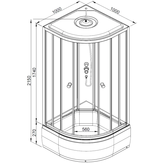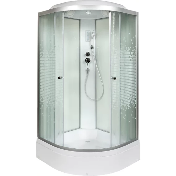 Душевой шланг, Душевая лейка, Держатель для душевой лейки, Подключение для душевого шланга, Ручки, Подсветка, Верхний душ, Динамик, Металлический каркас, Поддон, Радио, Смеситель, Сифон, Ножки
