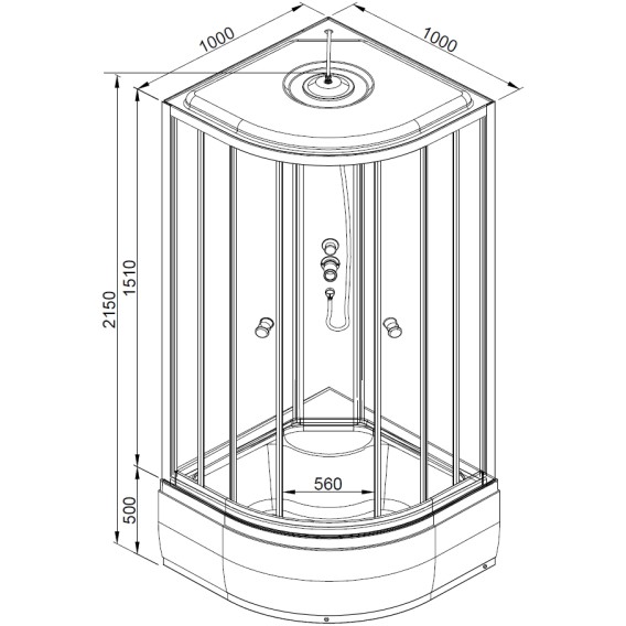 Душевой шланг, Душевая лейка, Держатель для душевой лейки, Подключение для душевого шланга, Ручки, Верхний душ, Металлический каркас, Поддон, Сиденье, Смеситель, Сифон, Ножки