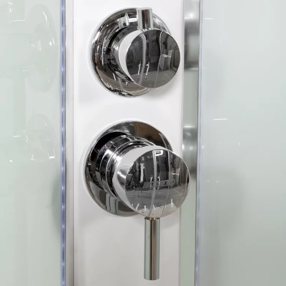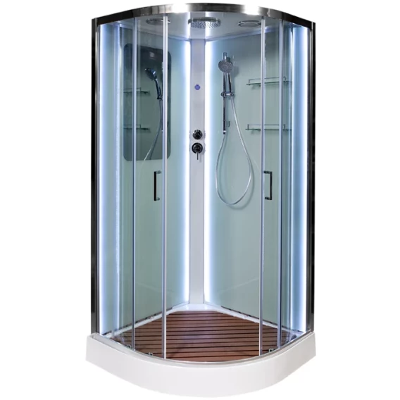 Душевой шланг, Душевая лейка, Держатель для душевой лейки, Полочка, Ручки, LED подсветка, Верхний душ, Металлический каркас, Поддон, Смеситель, Сифон, Штанга душевая, Ножки, Зеркало, Настил