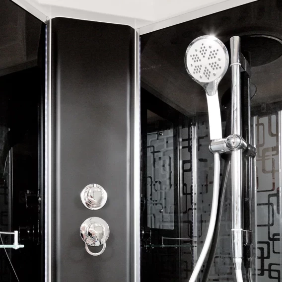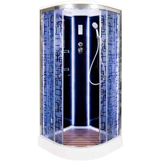 Душевой шланг, Душевая лейка, Держатель для душевой лейки, Полочка, Ручки, LED подсветка, Верхний душ, Динамик, Металлический каркас, Поддон, Радио, Смеситель, Сифон, Штанга душевая, Ножки, Зеркало, Настил