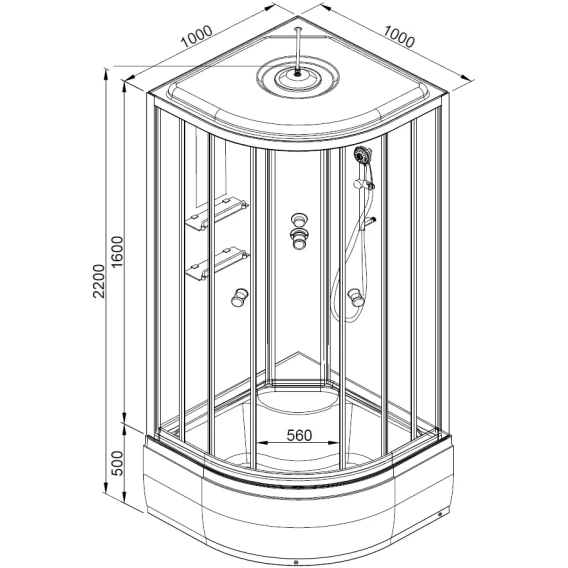 Душевой шланг, Душевая лейка, Держатель для душевой лейки, Полочка, Ручки, Подсветка, Верхний душ, Динамик, Металлический каркас, Поддон, Сиденье, Радио, Смеситель, Сифон, Штанга душевая, Ножки, Зеркало