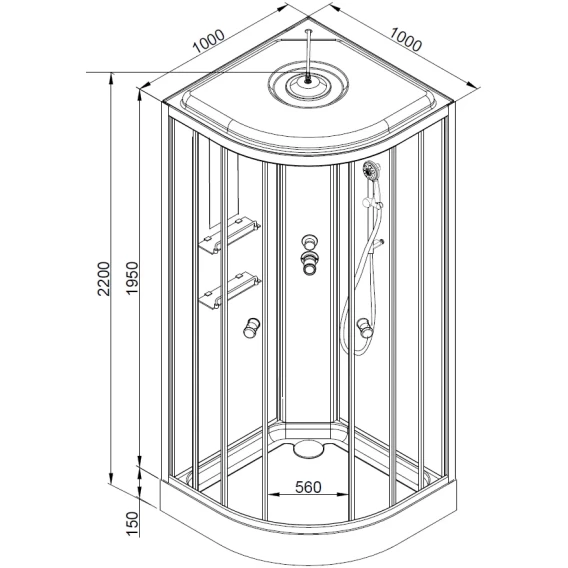 Душевой шланг, Душевая лейка, Держатель для душевой лейки, Полочка, Ручки, LED подсветка, Верхний душ, Динамик, Металлический каркас, Поддон, Радио, Смеситель, Сифон, Штанга душевая, Ножки, Зеркало, Настил
