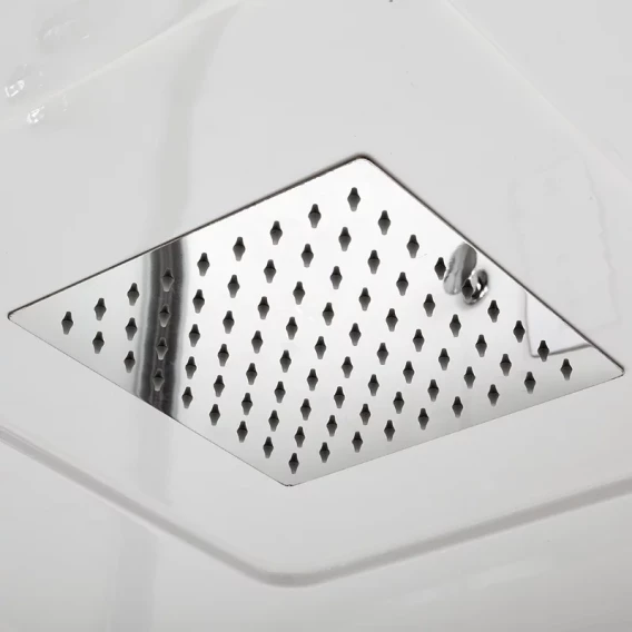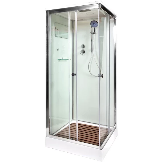Душевой шланг, Душевая лейка, Держатель для душевой лейки, Полочка, Ручки, Верхний душ, Крючок, Металлический каркас, Поддон, Смеситель, Сифон, Штанга душевая, Ножки, Зеркало, Настил