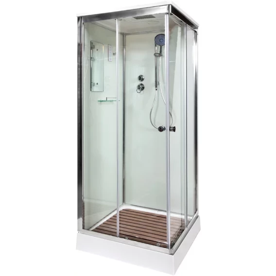 Душевой шланг, Душевая лейка, Держатель для душевой лейки, Полочка, Ручки, LED подсветка, Верхний душ, Крючок, Динамик, Металлический каркас, Поддон, Радио, Смеситель, Сифон, Штанга душевая, Ножки, Зеркало, Настил
