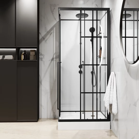 Душевой шланг, Душевая лейка, Держатель для душевой лейки, Подключение для душевого шланга, Полочка, Ручки, Верхний душ, Поддон, Смеситель, Сифон, Кронштейн, Ножки