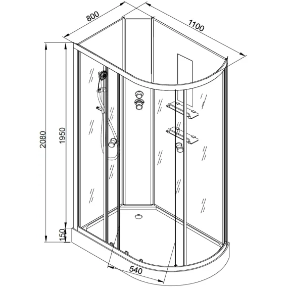 Душевой шланг, Душевая лейка, Держатель для душевой лейки, Полочка, Ручки, Металлический каркас, Поддон, Смеситель, Сифон, Штанга душевая, Ножки, Зеркало, Настил