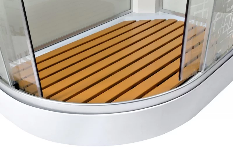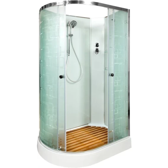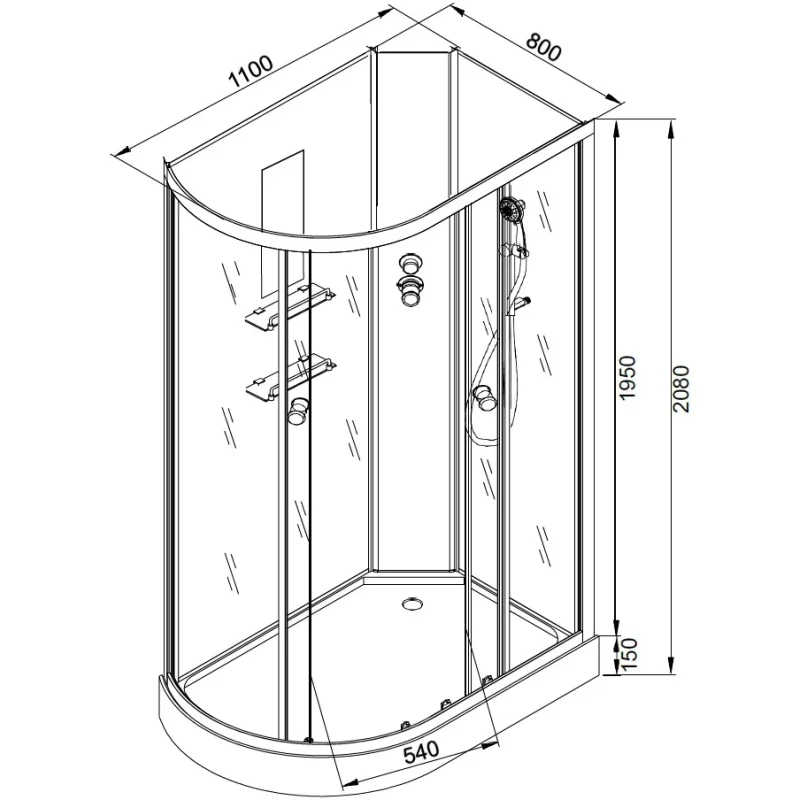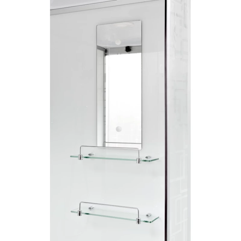 Душевой шланг, Душевая лейка, Держатель для душевой лейки, Полочка, Ручки, Металлический каркас, Поддон, Смеситель, Сифон, Штанга душевая, Ножки, Зеркало, Настил