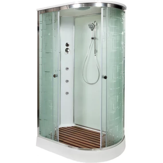 Душевой шланг, Душевая лейка, Держатель для душевой лейки, Полочка, Ручки, Верхний душ, Металлический каркас, Поддон, Смеситель, Сифон, Штанга душевая, Ножки, Зеркало, Настил