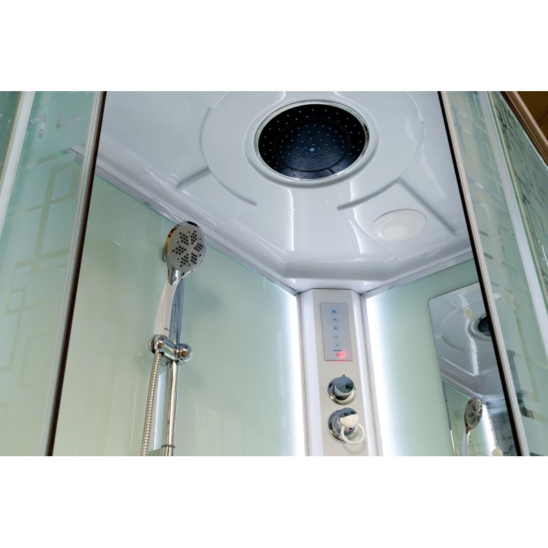 Душевой шланг, Душевая лейка, Держатель для душевой лейки, Полочка, Ручки, LED подсветка, Верхний душ, Динамик, Металлический каркас, Поддон, Радио, Смеситель, Сифон, Штанга душевая, Ножки, Зеркало, Настил