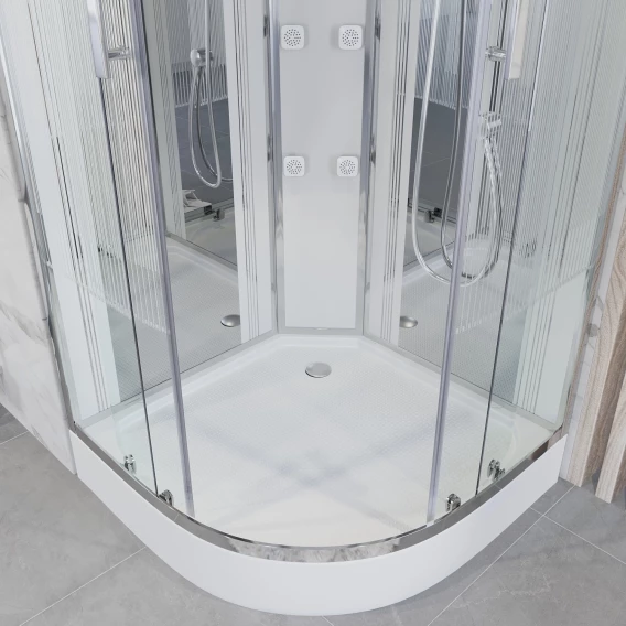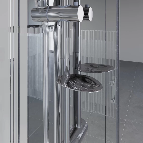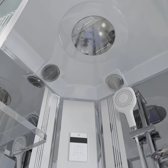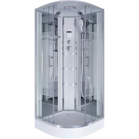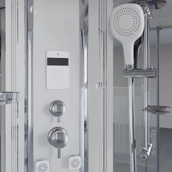 Душевой шланг, Душевая лейка, Держатель для душевой лейки, Подключение для душевого шланга, Полочка, Верхний душ, Динамик, Поддон, Радио, Смеситель, Сифон, Мыльница, Штанга душевая, Ножки, Зеркало