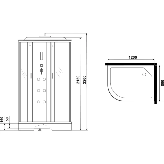 Душевой шланг, Душевая лейка, Держатель для душевой лейки, Подключение для душевого шланга, Полочка, Верхний душ, Динамик, Поддон, Радио, Смеситель, Сифон, Мыльница, Штанга душевая, Ножки, Зеркало