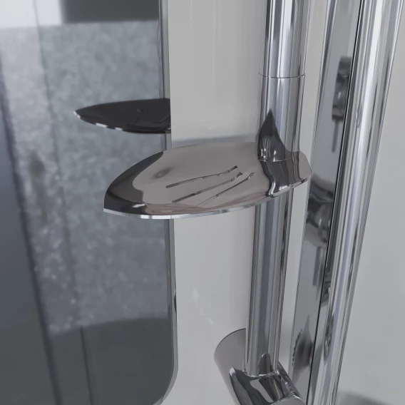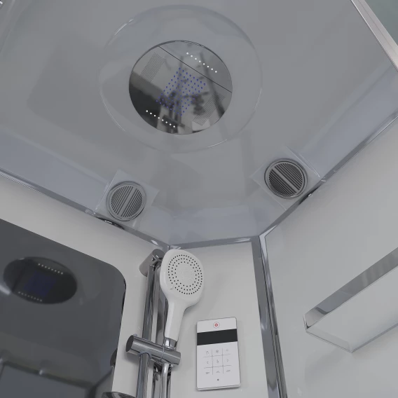 Душевой шланг, Душевая лейка, Держатель для душевой лейки, Подключение для душевого шланга, Полочка, Верхний душ, Динамик, Поддон, Сиденье, Радио, Смеситель, Сифон, Мыльница, Штанга душевая, Ножки, Зеркало