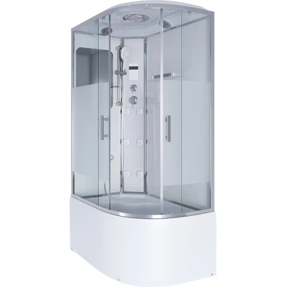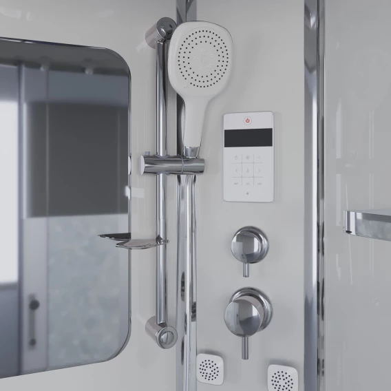 Душевой шланг, Душевая лейка, Держатель для душевой лейки, Подключение для душевого шланга, Полочка, Верхний душ, Динамик, Поддон, Сиденье, Радио, Смеситель, Сифон, Мыльница, Штанга душевая, Ножки, Зеркало
