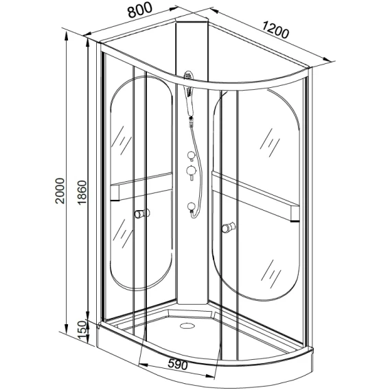 Душевой шланг, Душевая лейка, Держатель для душевой лейки, Подключение для душевого шланга, Ручки, Металлический каркас, Поддон, Смеситель, Сифон, Ножки