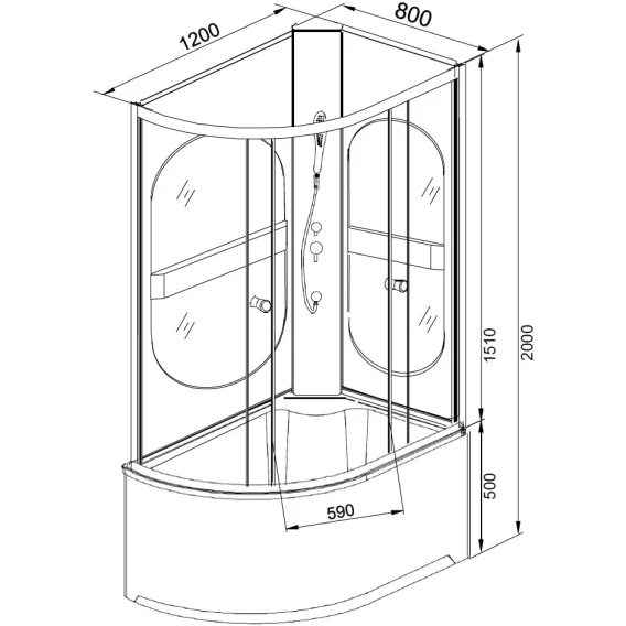 Душевой шланг, Душевая лейка, Держатель для душевой лейки, Подключение для душевого шланга, Ручки, Металлический каркас, Поддон, Сиденье, Смеситель, Сифон, Ножки