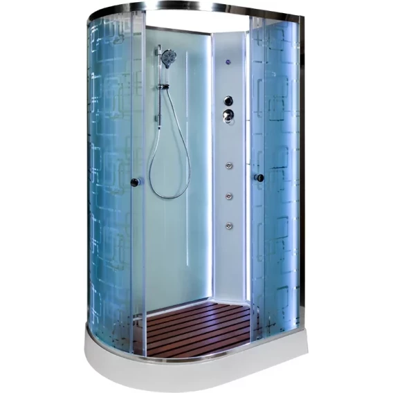 Душевой шланг, Душевая лейка, Держатель для душевой лейки, Полочка, Ручки, LED подсветка, Металлический каркас, Поддон, Смеситель, Сифон, Штанга душевая, Ножки, Зеркало, Настил