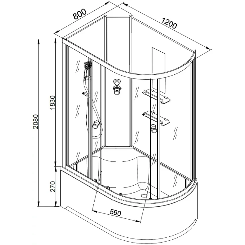Душевой шланг, Душевая лейка, Держатель для душевой лейки, Полочка, Ручки, Металлический каркас, Поддон, Смеситель, Сифон, Штанга душевая, Ножки, Зеркало