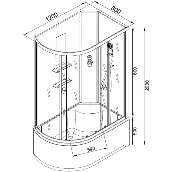 Душевой шланг, Душевая лейка, Держатель для душевой лейки, Полочка, Ручки, LED подсветка, Металлический каркас, Поддон, Сиденье, Смеситель, Сифон, Штанга душевая, Ножки, Зеркало