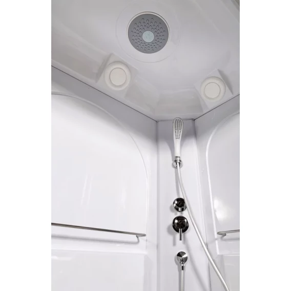 Душевой шланг, Душевая лейка, Держатель для душевой лейки, Подключение для душевого шланга, Ручки, Верхний душ, Металлический каркас, Поддон, Смеситель, Сифон, Ножки