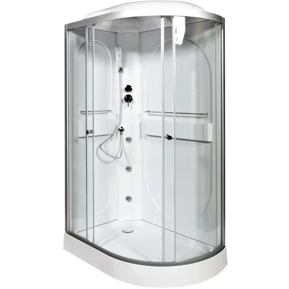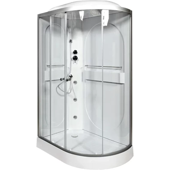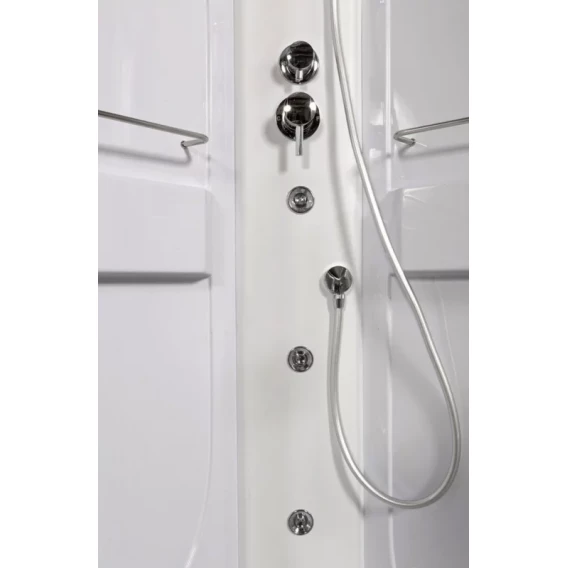 Душевой шланг, Душевая лейка, Держатель для душевой лейки, Подключение для душевого шланга, Ручки, Верхний душ, Металлический каркас, Поддон, Смеситель, Сифон, Ножки