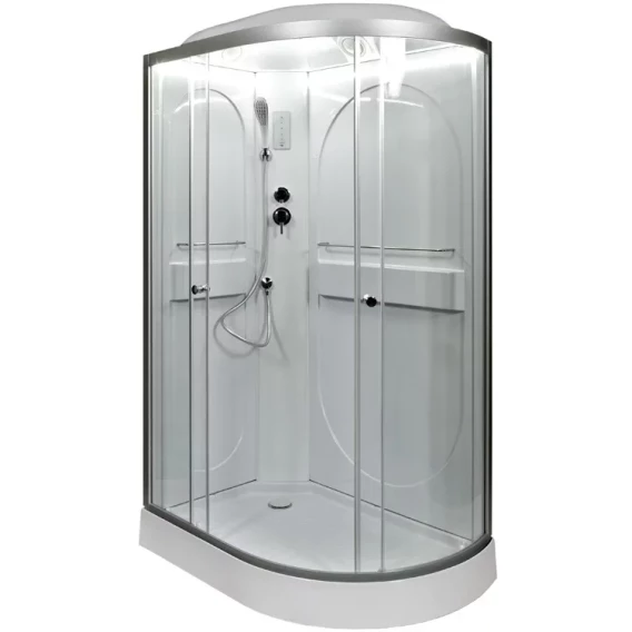 Душевой шланг, Душевая лейка, Держатель для душевой лейки, Подключение для душевого шланга, Ручки, LED подсветка, Верхний душ, Динамик, Металлический каркас, Поддон, Радио, Смеситель, Сифон, Ножки