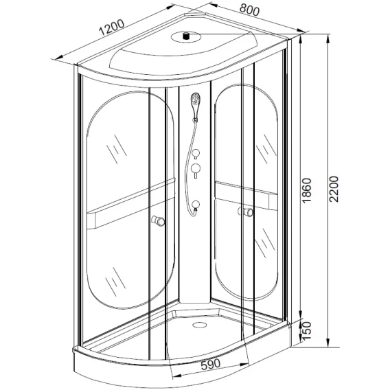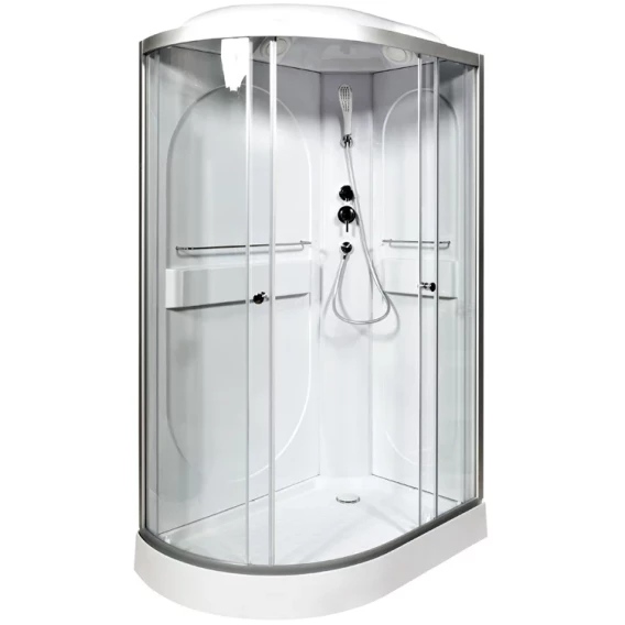 Душевой шланг, Душевая лейка, Держатель для душевой лейки, Подключение для душевого шланга, Ручки, Верхний душ, Металлический каркас, Поддон, Смеситель, Сифон, Ножки