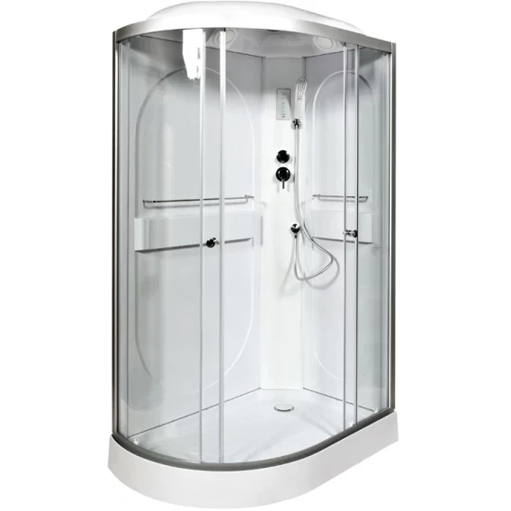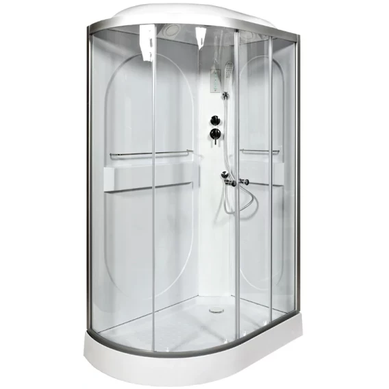 Душевой шланг, Душевая лейка, Держатель для душевой лейки, Подключение для душевого шланга, Ручки, Подсветка, Верхний душ, Динамик, Металлический каркас, Поддон, Радио, Смеситель, Сифон, Ножки
