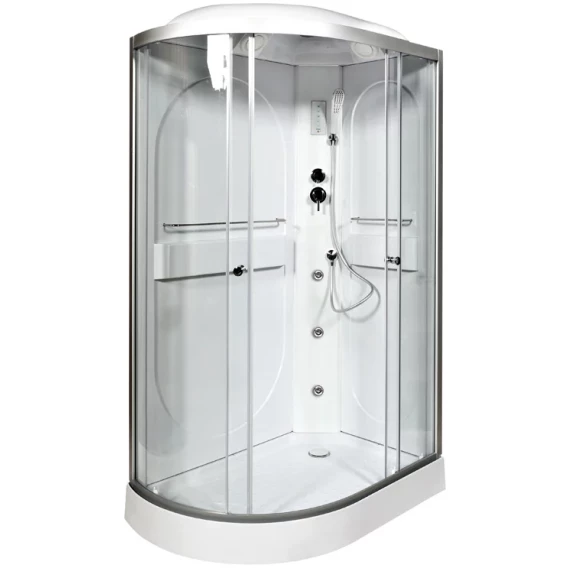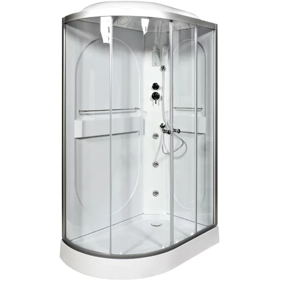 Душевой шланг, Душевая лейка, Держатель для душевой лейки, Подключение для душевого шланга, Ручки, Подсветка, Верхний душ, Динамик, Металлический каркас, Поддон, Радио, Смеситель, Сифон, Ножки