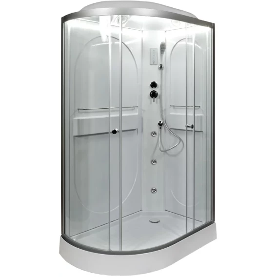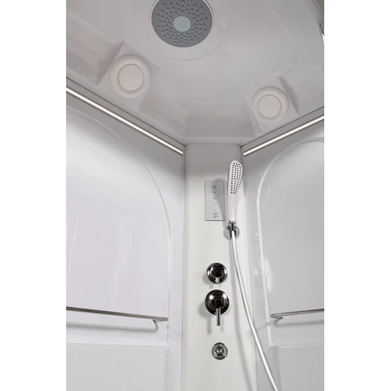 Душевой шланг, Душевая лейка, Держатель для душевой лейки, Подключение для душевого шланга, Ручки, LED подсветка, Верхний душ, Динамик, Металлический каркас, Поддон, Радио, Смеситель, Сифон, Ножки