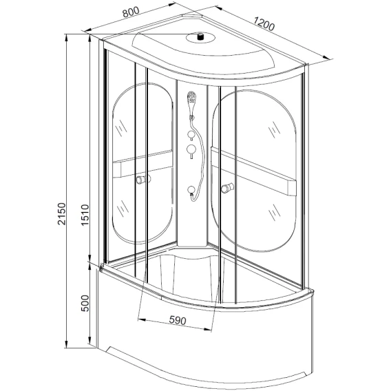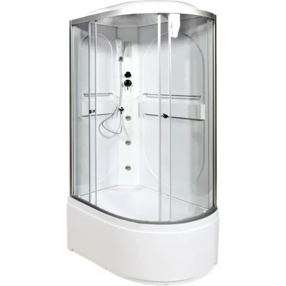Душевой шланг, Душевая лейка, Держатель для душевой лейки, Подключение для душевого шланга, Ручки, Подсветка, Верхний душ, Динамик, Металлический каркас, Поддон, Сиденье, Радио, Смеситель, Сифон, Ножки
