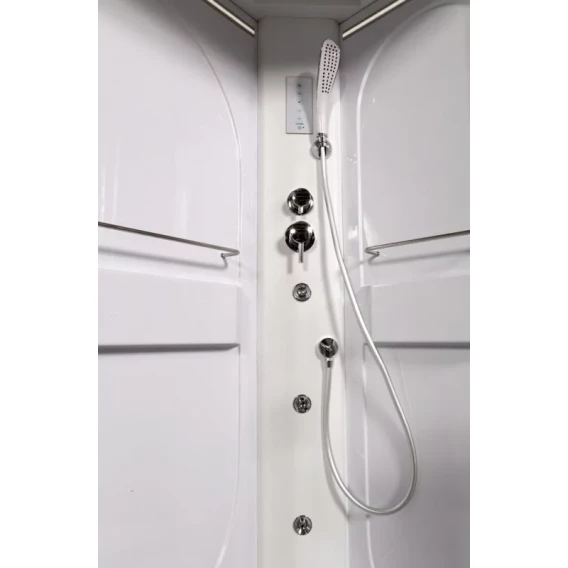 Душевой шланг, Душевая лейка, Держатель для душевой лейки, Подключение для душевого шланга, Ручки, LED подсветка, Верхний душ, Динамик, Металлический каркас, Поддон, Сиденье, Радио, Смеситель, Сифон, Ножки
