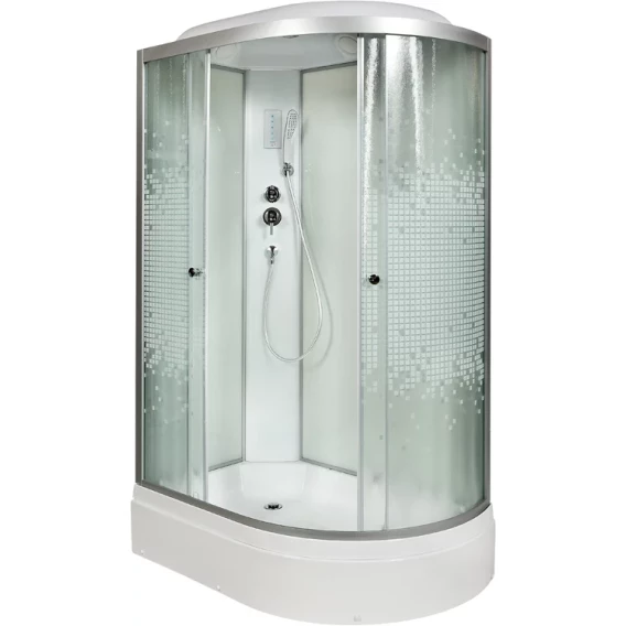 Душевой шланг, Душевая лейка, Держатель для душевой лейки, Подключение для душевого шланга, Ручки, Подсветка, Верхний душ, Динамик, Металлический каркас, Поддон, Радио, Смеситель, Сифон, Ножки