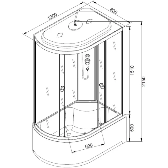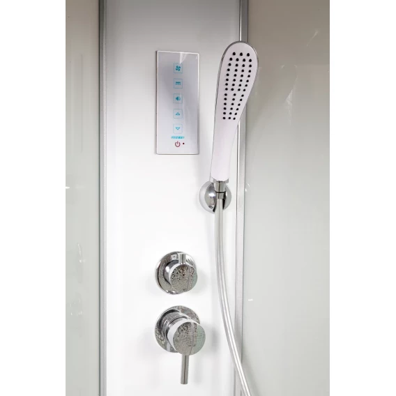 Душевой шланг, Душевая лейка, Держатель для душевой лейки, Подключение для душевого шланга, Ручки, Подсветка, Верхний душ, Динамик, Металлический каркас, Поддон, Сиденье, Радио, Смеситель, Сифон, Ножки
