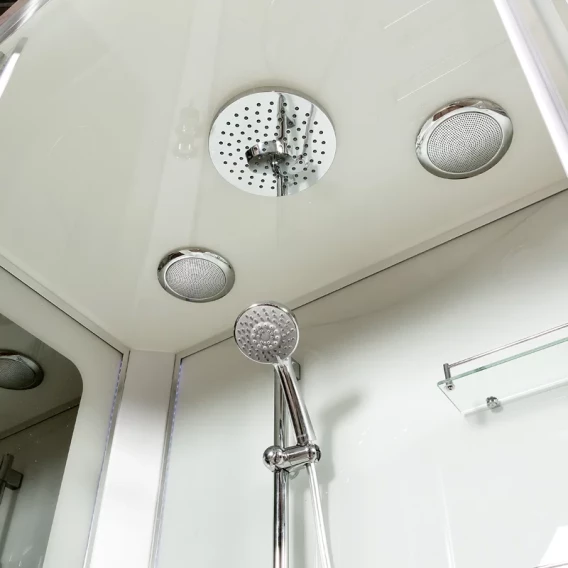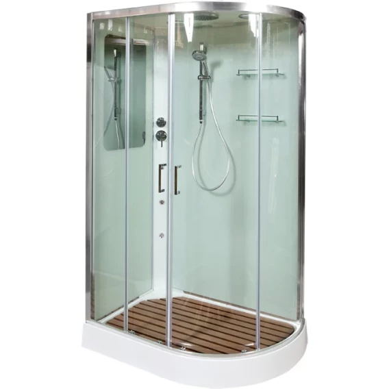 Душевой шланг, Душевая лейка, Держатель для душевой лейки, Полочка, Ручки, Верхний душ, Металлический каркас, Поддон, Смеситель, Сифон, Штанга душевая, Ножки, Зеркало, Настил