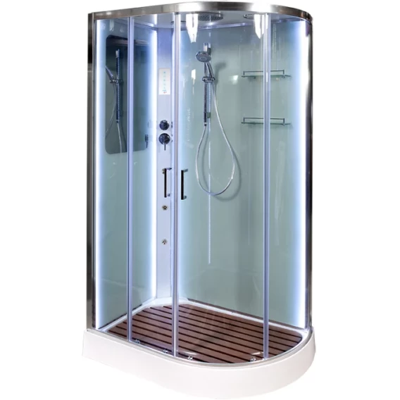 Душевой шланг, Душевая лейка, Держатель для душевой лейки, Полочка, Ручки, LED подсветка, Верхний душ, Динамик, Металлический каркас, Поддон, Радио, Смеситель, Сифон, Штанга душевая, Ножки, Зеркало, Настил