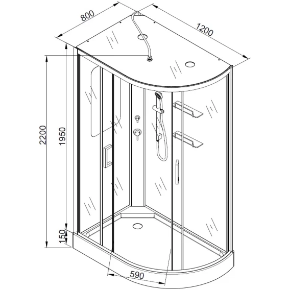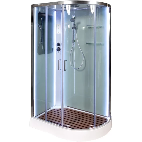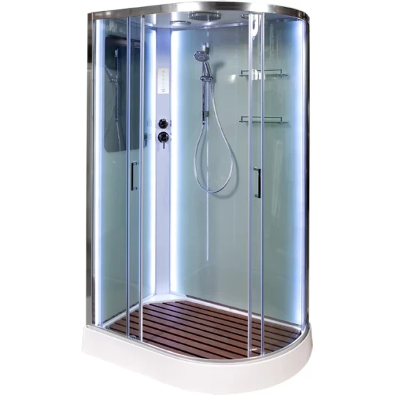 Душевой шланг, Душевая лейка, Держатель для душевой лейки, Полочка, Ручки, LED подсветка, Верхний душ, Динамик, Металлический каркас, Поддон, Радио, Смеситель, Сифон, Штанга душевая, Ножки, Зеркало, Настил