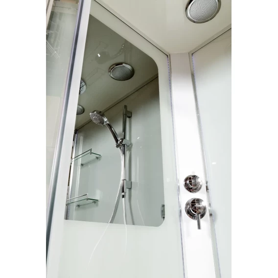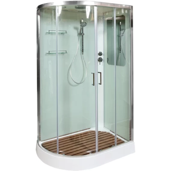 Душевой шланг, Душевая лейка, Держатель для душевой лейки, Полочка, Ручки, Верхний душ, Металлический каркас, Поддон, Смеситель, Сифон, Штанга душевая, Ножки, Зеркало, Настил