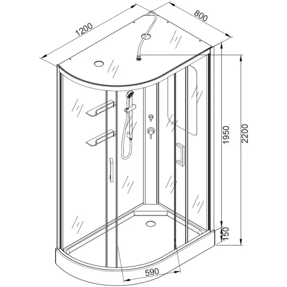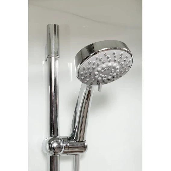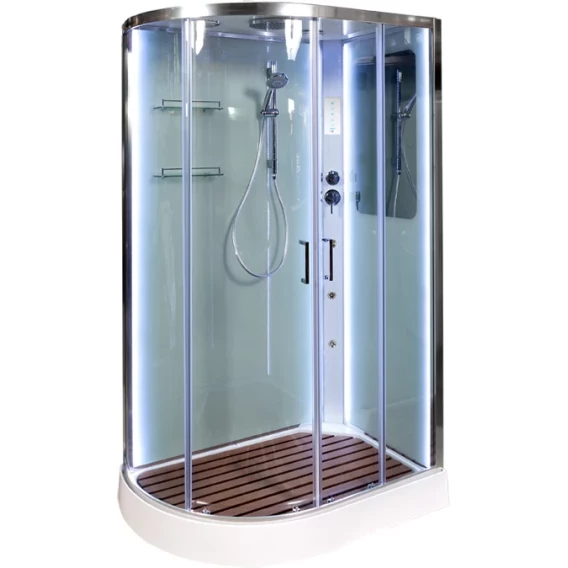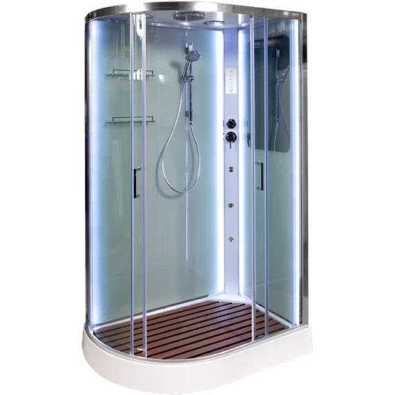 Душевой шланг, Душевая лейка, Держатель для душевой лейки, Полочка, Ручки, LED подсветка, Верхний душ, Динамик, Металлический каркас, Поддон, Радио, Смеситель, Сифон, Штанга душевая, Ножки, Зеркало, Настил
