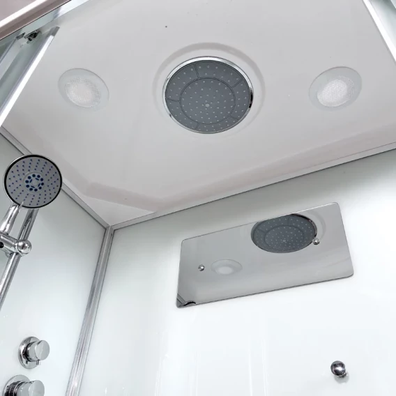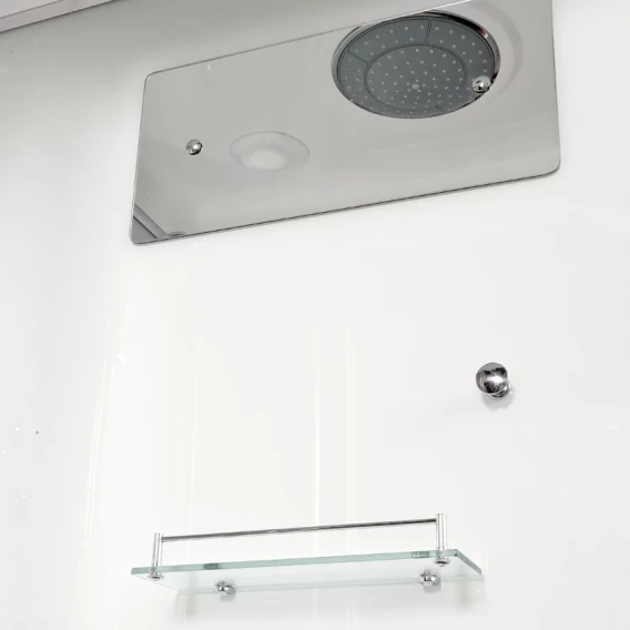 Душевой шланг, Душевая лейка, Держатель для душевой лейки, Полочка, Ручки, Верхний душ, Крючок, Металлический каркас, Поддон, Смеситель, Сифон, Штанга душевая, Ножки, Зеркало