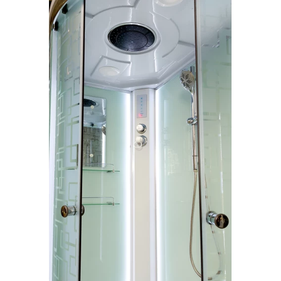 Душевой шланг, Душевая лейка, Держатель для душевой лейки, Полочка, Ручки, LED подсветка, Верхний душ, Динамик, Металлический каркас, Поддон, Радио, Смеситель, Сифон, Штанга душевая, Ножки, Зеркало, Настил