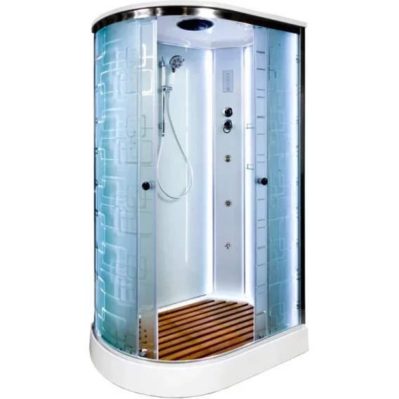 Душевой шланг, Душевая лейка, Держатель для душевой лейки, Полочка, Ручки, LED подсветка, Верхний душ, Динамик, Металлический каркас, Поддон, Радио, Смеситель, Сифон, Штанга душевая, Ножки, Зеркало, Настил