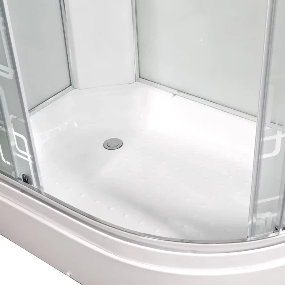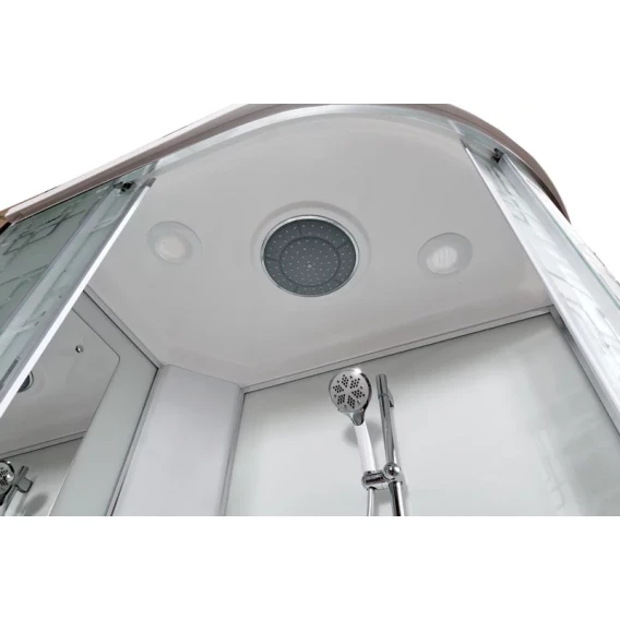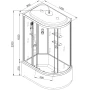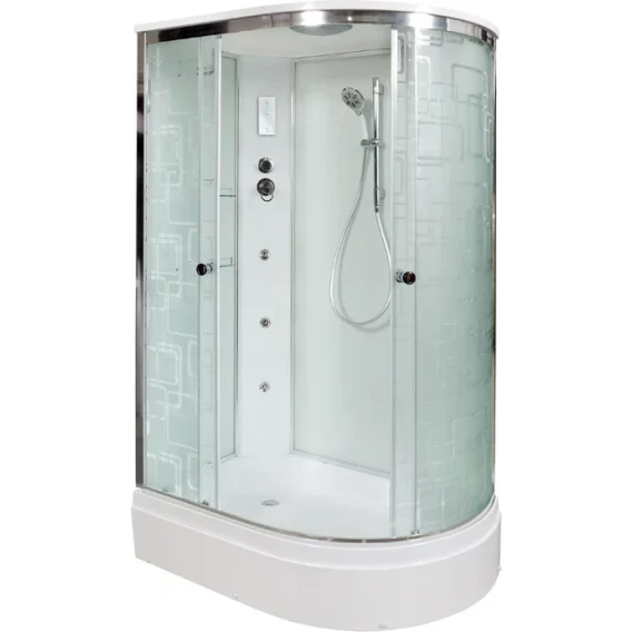 Душевой шланг, Душевая лейка, Держатель для душевой лейки, Полочка, Ручки, Подсветка, Верхний душ, Динамик, Металлический каркас, Поддон, Радио, Смеситель, Сифон, Штанга душевая, Ножки, Зеркало